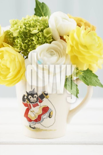 A vintage white cat mug is filled with a small floral arrangement of white and yellow roses.