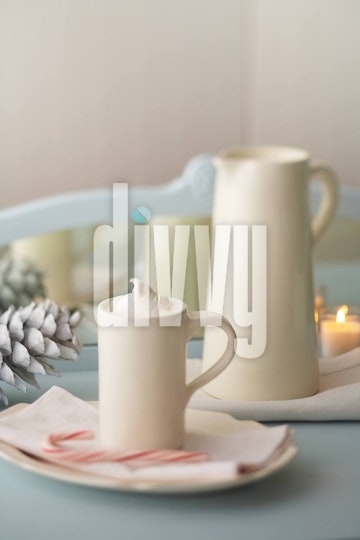 A white mug filled with hot chocolate is topped with a peak of whipped cream and served on a saucer with a candy cane.