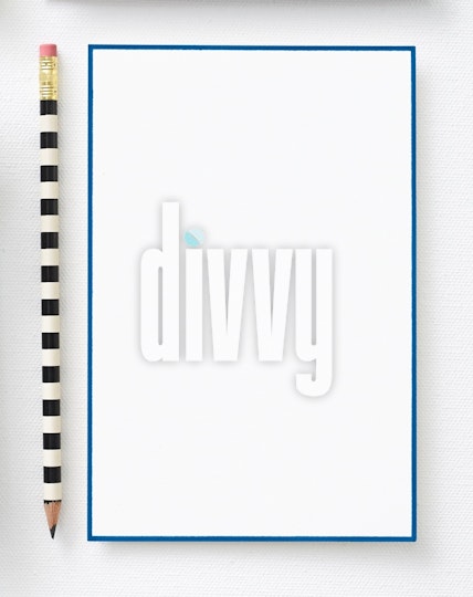A piece of white card stock paper with a royal blue border next to a black and white striped pencil on a white textured background.
