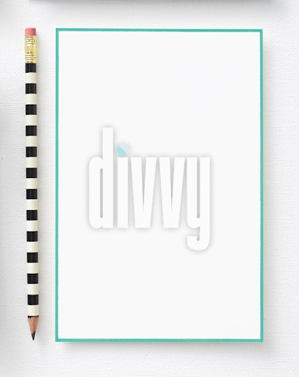 A piece of white card stock paper with a turquoise border next to a black and white striped pencil on a white textured background.