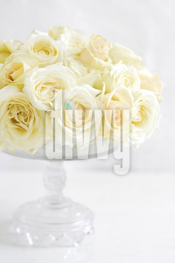 A bunch of white roses gathered on top of a glass pedestal centerpiece sits on white.