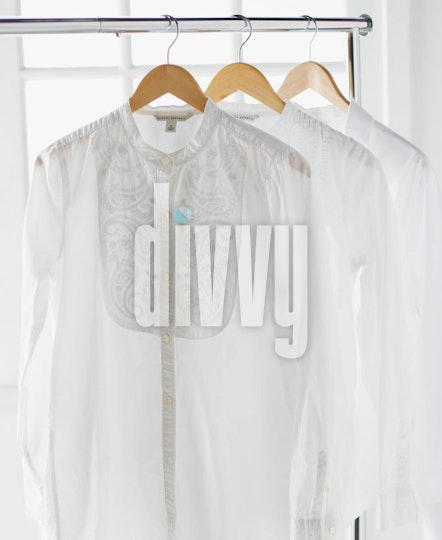 A clothing rack holds three dressy white shirts on wooden hangers.