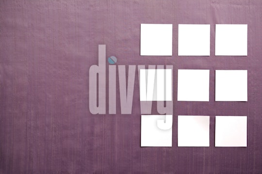White paper squares are arranged in a 3x3 grid on textured purple fabric.