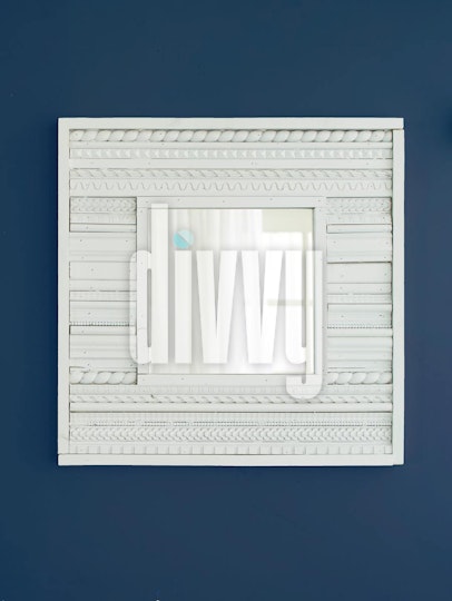 A DIY white wood mirror hangs on a dark navy blue wall.