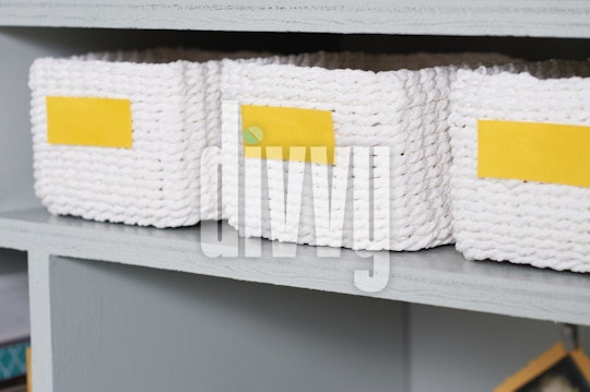 Three cotton baskets with yellow labels sit on a shelf in a home office space.