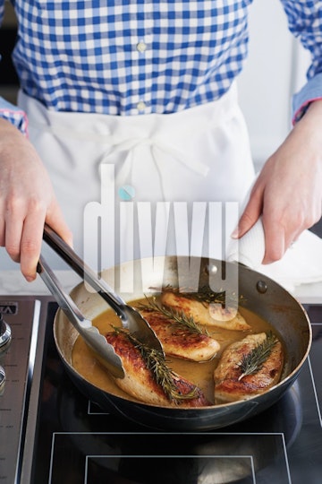 A woman in a blue gingham shirt cooking chicken breast in a silver pan on the stovetop.