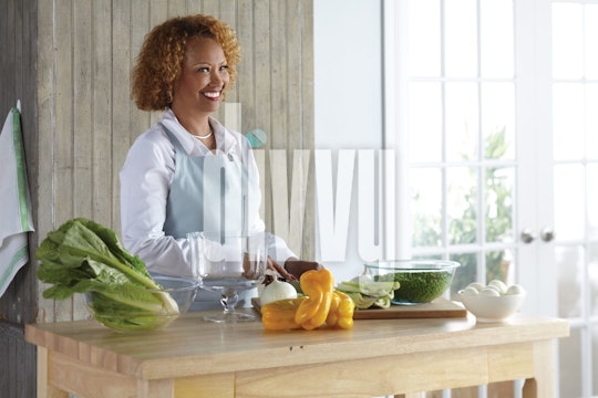 A woman stands at a kitchen island cutting veggies for a seven-layer lettuce salad.