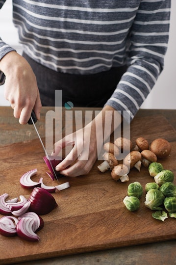 A woman chops raw vegetables on a wood cutting board placed on a kitchen counter