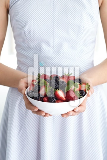 A woman in a blue striped sundress holds a white bowl full of fresh berries.