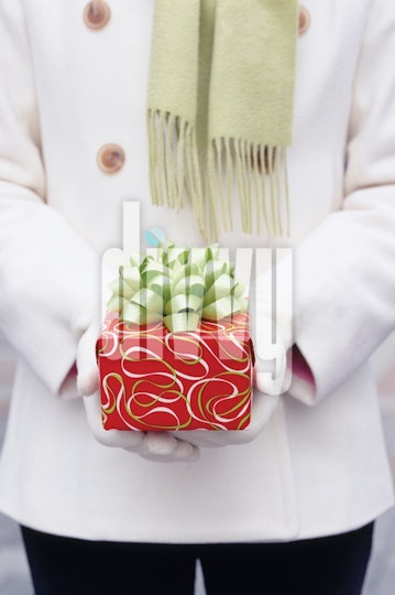 A woman in a white pea coat and green scarf holds a red Christmas gift tied with a green bow.