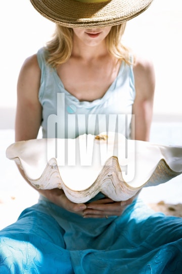 A woman in a light blue and turquoise dress and woven hat sits on beach holding a large seashell.