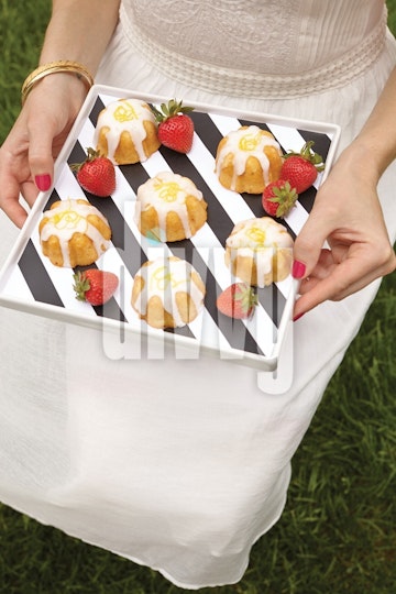 A woman wearing a white dress sits in grass holding a black and white striped tray of mini strawberry shortcakes drizzled with icing and topped with lemon shavings next to a few strawberries.