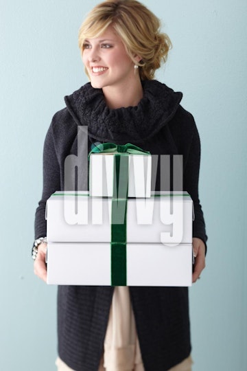 Woman Holding Stack of Wrapped Presents