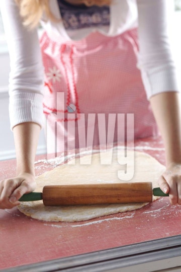 A woman in a red gingham apron rolls out dough with a vintage wood rolling pin.