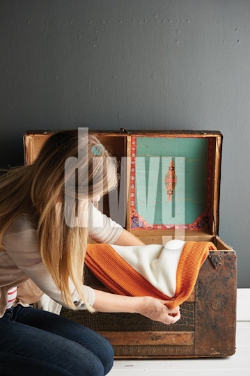 A woman is looking at a knitted blanked folded over the side of an antique trunk.