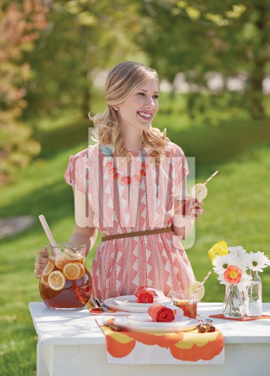 A woman holds a pitcher ice tea with lemon at an outdoor picnic table.