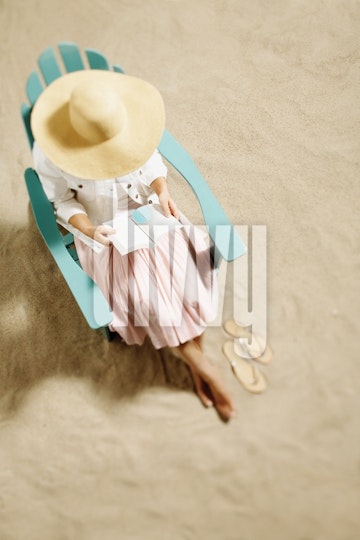 A woman wearing a sun hat reads a book on the beach in a teal chair.