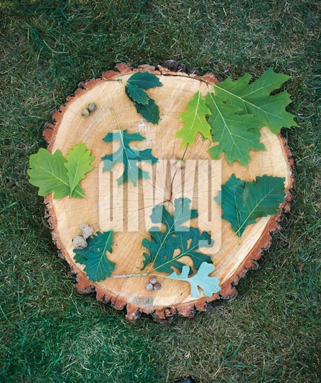 Various leaves in varying shades of green arranged in groups next to acorns rest on a tree stump surrounded by grass.