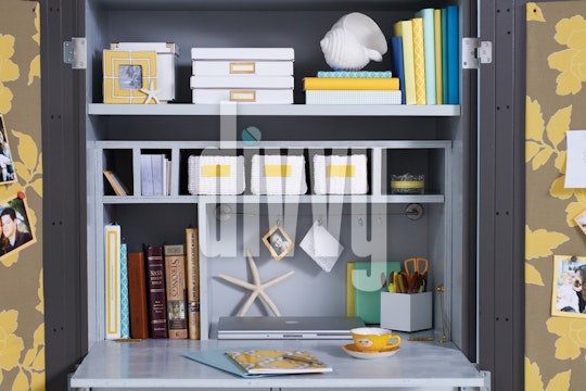 An armoire is set up to be a home office space, with storage for mementos, books and a place for a personal computer.
