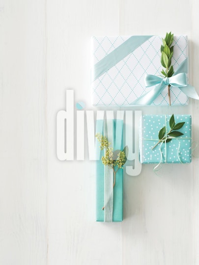 A group of three wrapped gifts of varying shapes tied with ribbon and accented with greenery sit on a painted wood background.
