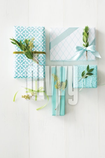 A group of five wrapped gifts of varying shapes tied with ribbon and accented with greenery sit on a painted wood background.