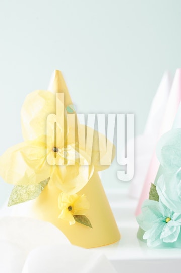 A yellow party hat is adorned with tissue paper flower decorations in front of a light blue wall.