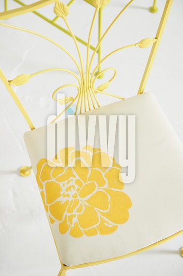 A floral cushion rests on a yellow metal outdoor chair on a white background.