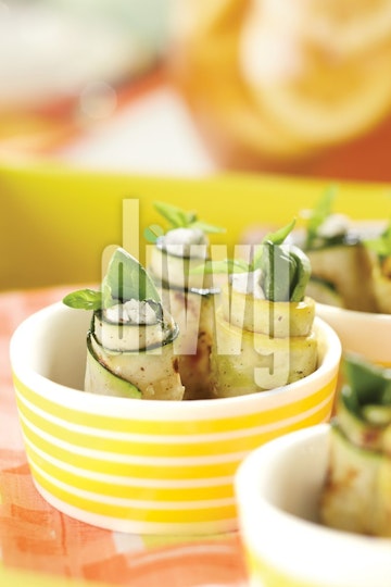 Zucchini and yellow squash wrap appetizers are filled with goat cheese and spinach and served in yellow striped dishes.