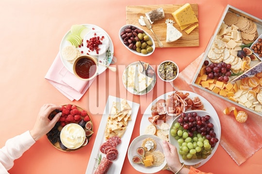 Guests take food from a cheese and charcuterie spread with fruit and bread on a coral pink tablecloth.