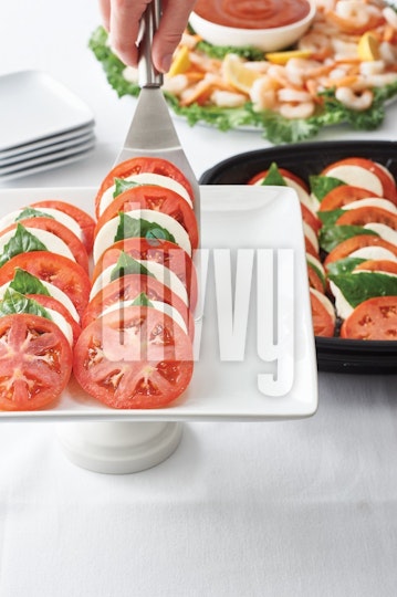 A man uses a metal spatula to serve tomatoes, mozzarella and basil slices from a Caprese salad in front of a shrimp cocktail platter in the background.