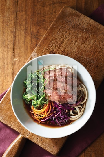 A Korean beef noodle bowl with soba noodles, broccoli, carrots, red cabbage and green onions is served on a wood cutting board.
