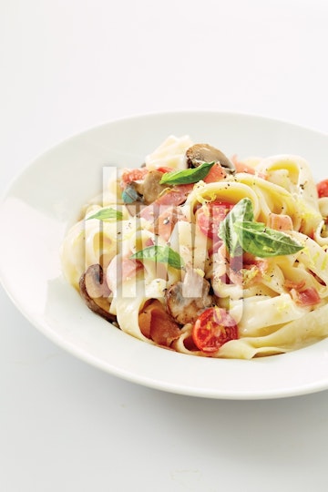 A bowl holds a single serving of fettuccini served with a white sauce, prosciutto, cherry tomatoes and mushrooms that is topped with basil and lemon zest.
