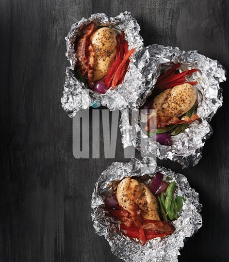 Three chicken dinners with bacon, bell pepper, onion and pea pods are cooked in aluminum foil pouches.