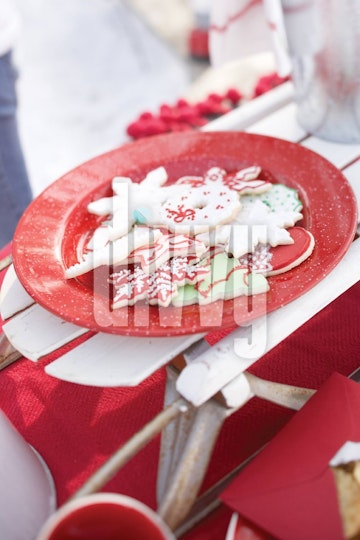 A red plate of decorated Christmas cookies are served on top of a vintage sled.