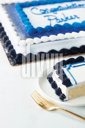 A decorated cake from a bakery says "Congratulations, Parker", with a piece of the cake served on a plate with a fork in the foreground.