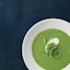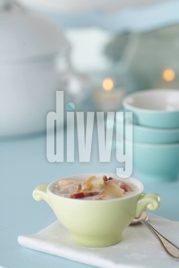 A bowl of clam chowder is served in a green handled bowl on a buffet with a stack of empty bowls and a soup tureen.