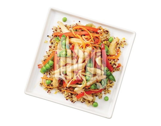 Chicken and vegetables are served on top of multi-colored quinoa on a square white plate.