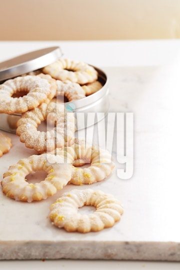 Lemon spritz cookies, some covered with glaze and lemon zest and some dusted with powdered sugar, spill out of an open tin.