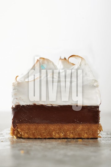 A s'mores fudge bar made of layers of graham cracker crust, chocolate fudge and marshmallow meringue rests on a stone surface.