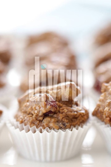 Three rows of oatmeal raisin muffins in white liners on a white surface.
