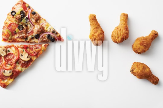 Two slices of assorted pizza—one with pepperoni, mushrooms and red peppers and one supreme—are arranged with breaded chicken drumsticks on a white surface.