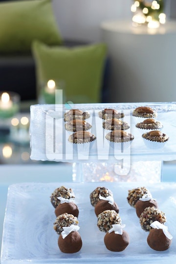 Frosted glass trays hold chocolate-mint truffles and bite-size turtle cheesecakes on a dessert table at a cocktail party.