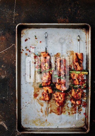 Saucy grilled BBQ salmon on metal skewers with green onions rests on a metal pan scattered with sweet pepper relish.