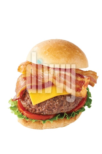 A thick hamburger is stacked on top of lettuce and tomato and piled with a slice of cheese, and bacon strips.