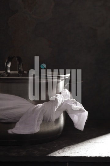 A white cotton towel is wrapped and tied around a stainless steel soup pot sitting on a dark stone background.