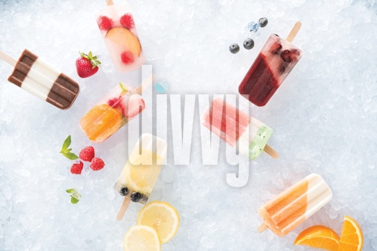 A variety of homemade pops—including mocha, blueberry lemonade, fruit poptail, mixed berry, watermelon slice, and orange split pops—are scattered on crushed ice with fresh fruit and mint leaves.