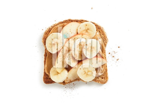 A toasted sprouted whole grain bread slice with an all-natural peanut butter spread is topped with apple and banana slices and a sprinkle of ground cinnamon.