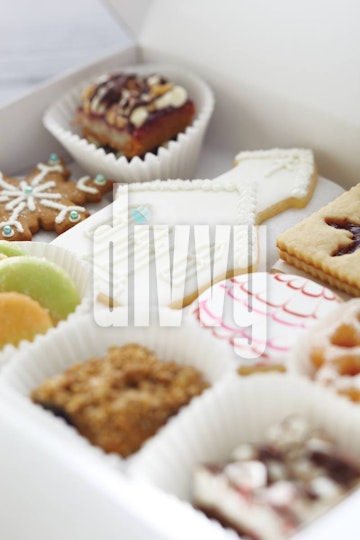 A box holds an assortment of decorated Christmas treats in white parchment cups.
