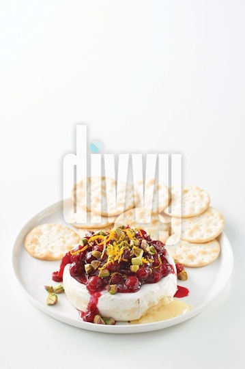 Melty baked Brie cheese topped with cranberry sauce and crushed pistachios and orange zest and served with a side of crackers.