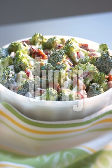 A creamy broccoli salad is studded with onions, dried cranberries, sunflower seeds and bacon.